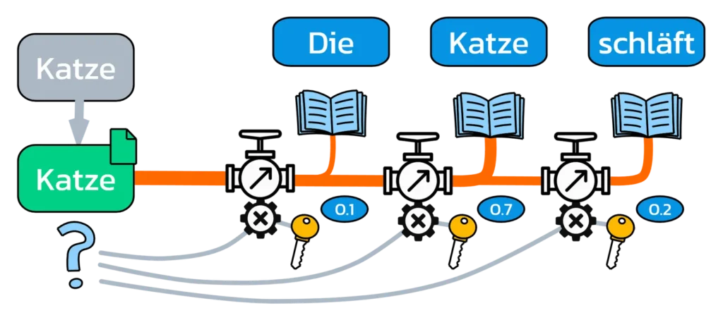 Am Ende erzeugt ein Decoder eine Wahrscheinlichkeitsverteilung über das Vokabular – und wählt das wahrscheinlichste nächste Token aus.