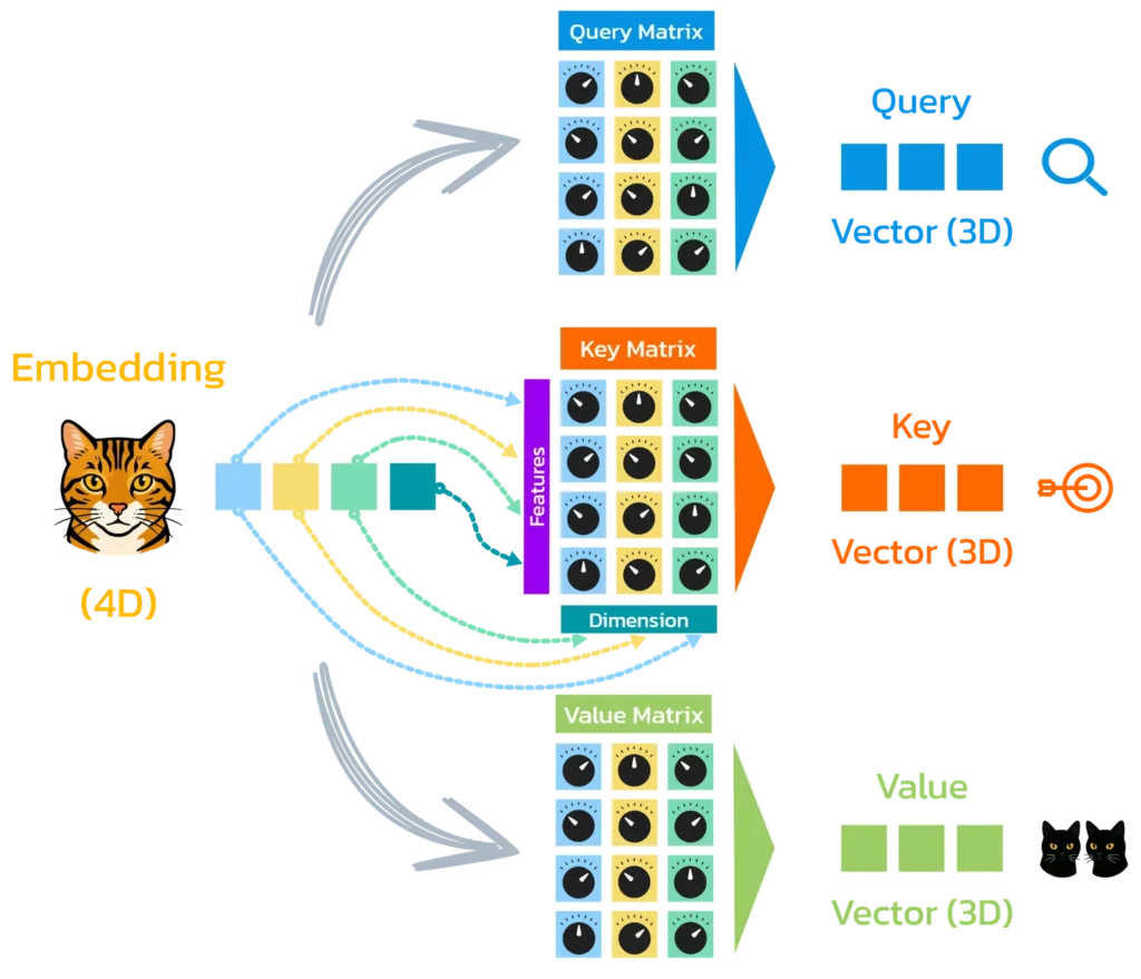 Aus diesem Embedding-Vektor werden durch Projektion drei neue Vektoren gebildet, die im Attention-Mechanismus unterschiedliche Funktionen erfüllen: