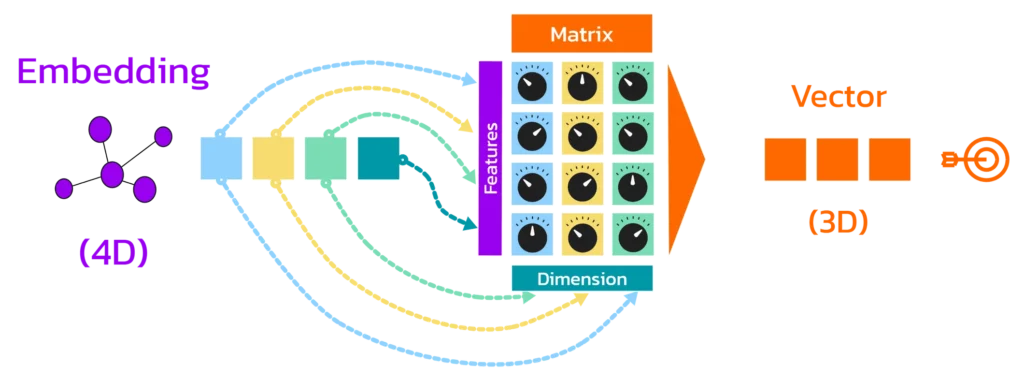 Jedes Token liegt ursprünglich als Embedding-Vektor vor – ein Vektor mit z. B. 12.288 Zahlen, die seine Bedeutung in einem hochdimensionalen Raum abbilden.